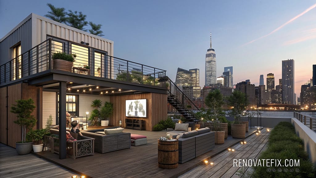 Lower section converts into outdoor cinema space with retractable projector screen and tiered seating, surrounded by container gardens full of herbs and vegetables.