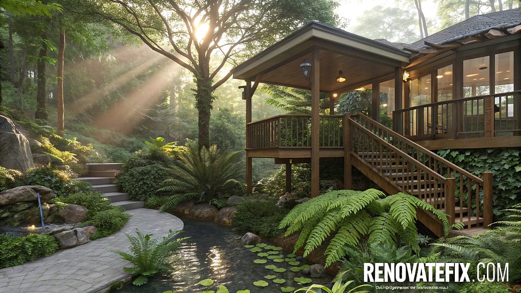 Lower story features shade-loving fern garden with moss-covered stone walls and naturally filtered pond system, creating microclimate paradise.