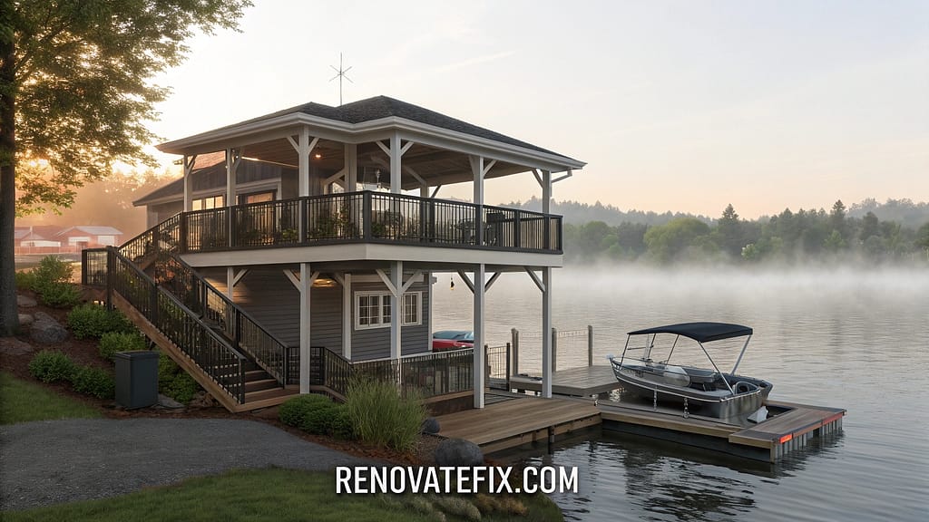 Lower deck extends over shoreline with covered boat slip and fishing platform, decorated with nautical touches and built-in storage solutions.