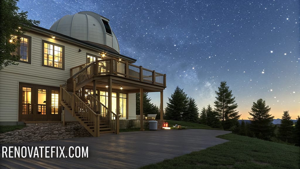 Lower section provides climate-controlled equipment room and study area with star charts, complemented by specialized dark-sky compliant lighting fixtures.