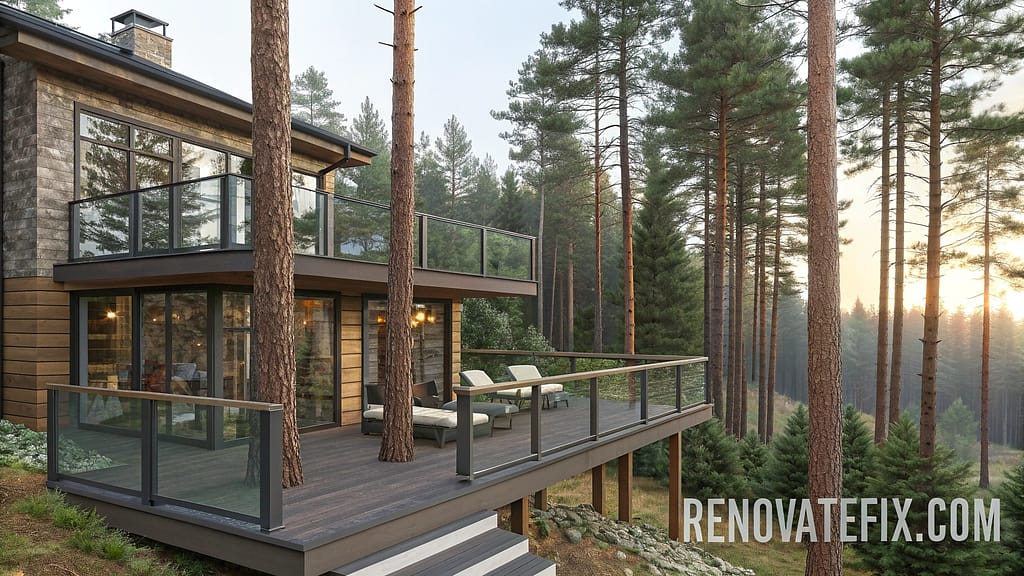 Suspended amidst towering pines, this cantilevered masterpiece features glass railings on both tiers, creating illusion of floating above ground.