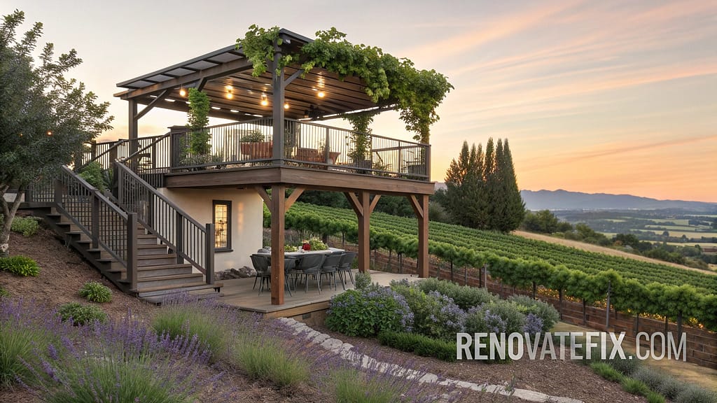 Wine country inspiration shapes this dual-level entertainment space where upper deck provides wine tasting area under grape-covered arbor.
