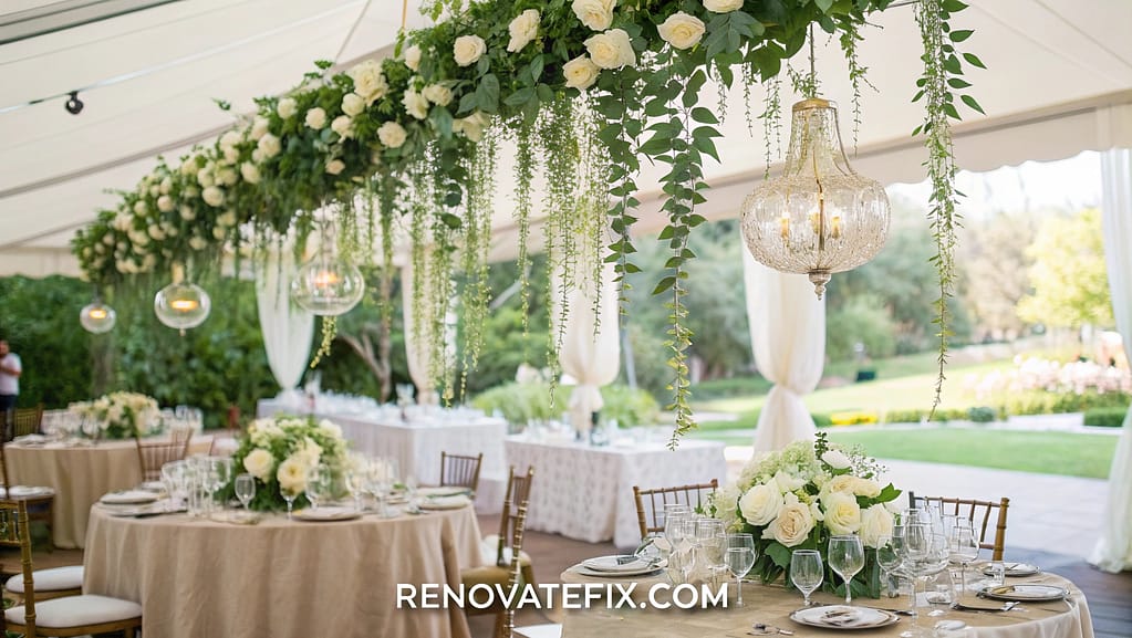 This stunning overhead display draws guests’ eyes upward while maximizing vertical space, offering a luxurious feel without overwhelming table arrangements.