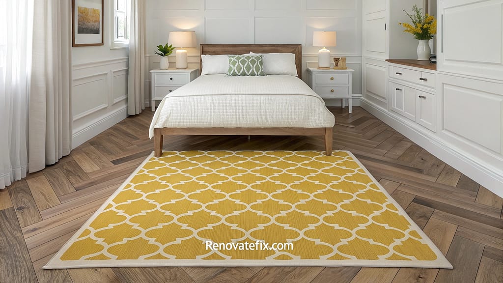 Anchor your bedroom with a primrose yellow patterned rug that adds warmth underfoot while introducing color and texture.