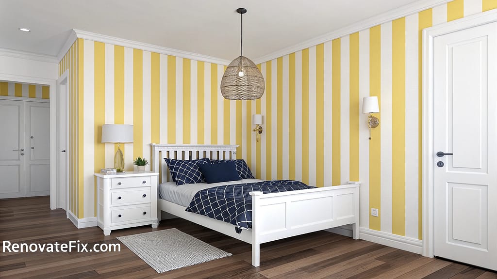 Embrace pattern with daffodil yellow striped wallpaper that adds movement and visual interest to your sleeping space.