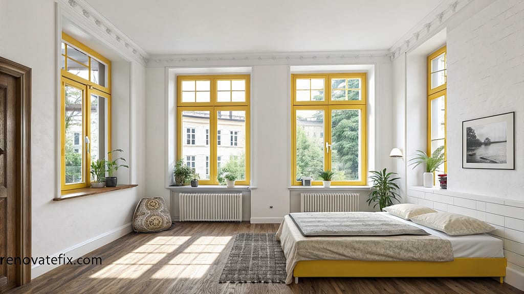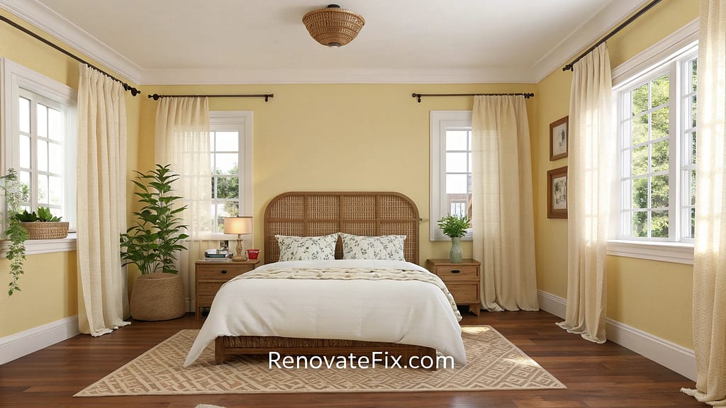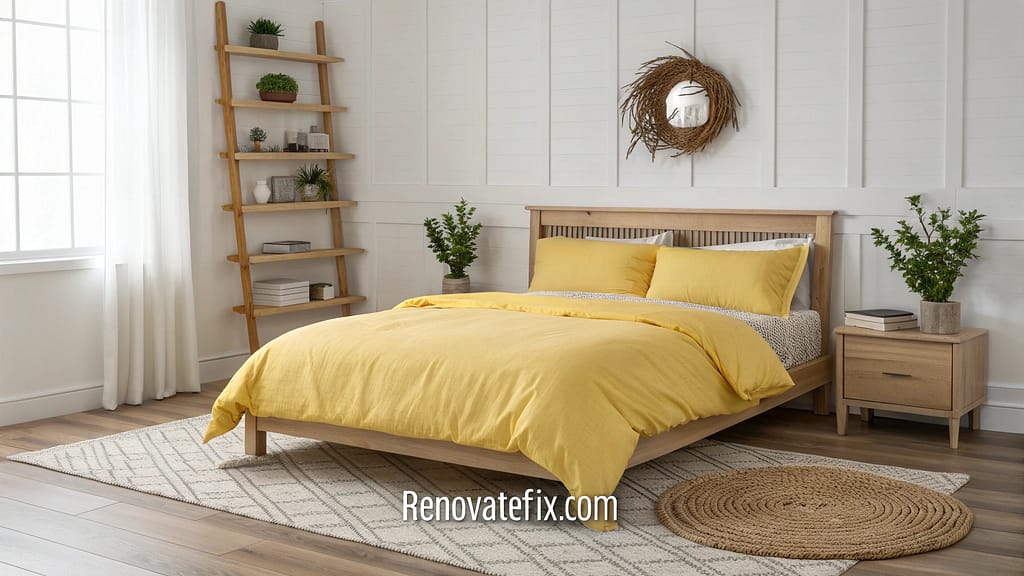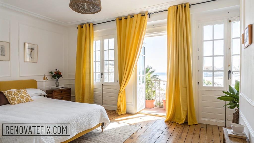 Frame your windows with sunflower yellow curtains that filter light beautifully throughout the day, casting a golden glow across your bedroom.