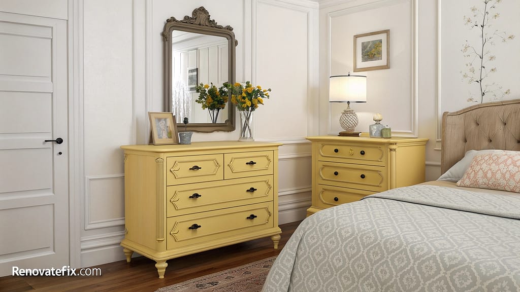 Refinish existing bedroom furniture in mellow yellow paint for budget-friendly personalization that revitalizes tired pieces.