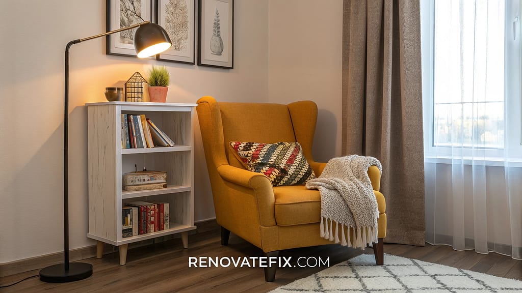 Carve out a cozy amber yellow reading corner in your bedroom with a comfortable chair, good lighting, and surrounding shelves.