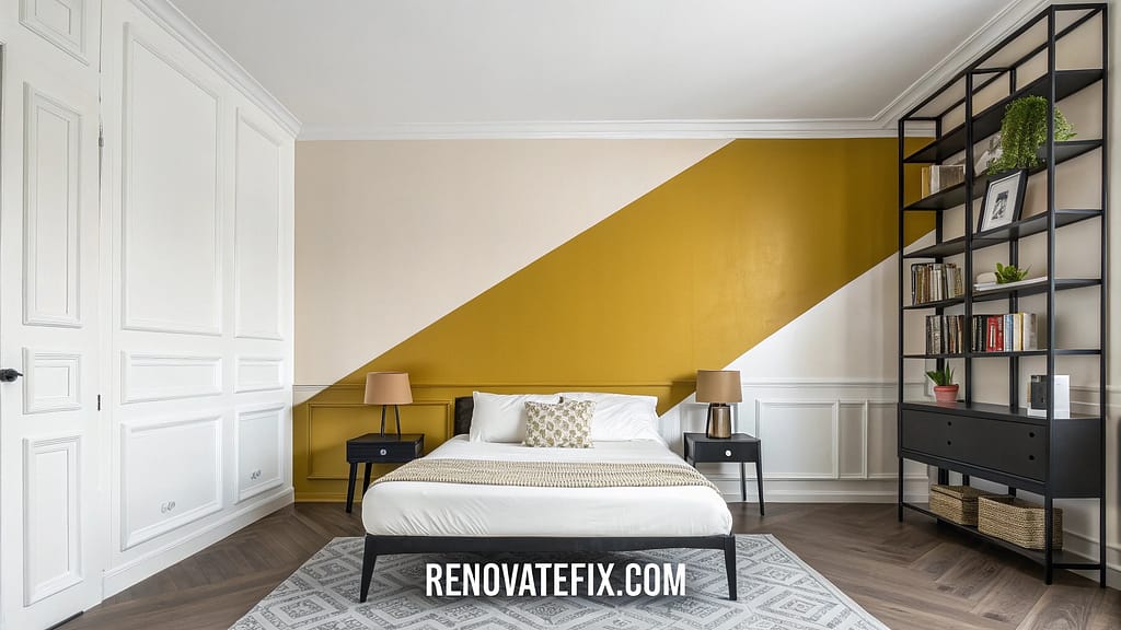 Divide your bedroom walls with cream and gold color blocking for architectural interest without permanent construction.