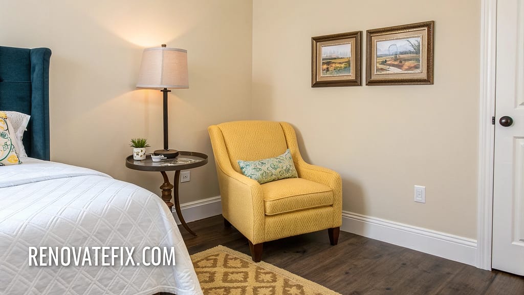 Place a pineapple yellow accent chair in an empty bedroom corner to create a functional vignette that brightens the entire space.