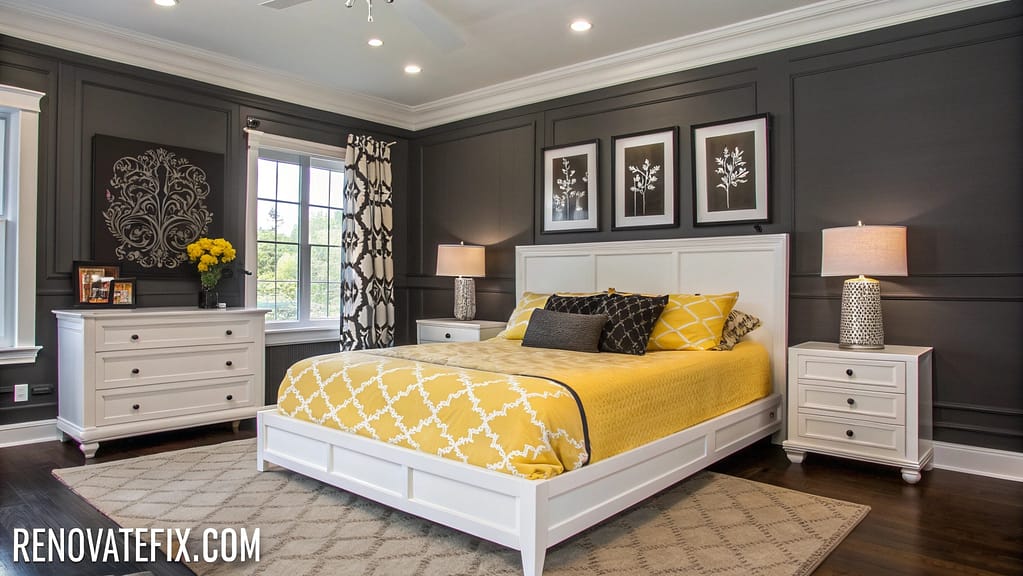 Pair bumblebee yellow with deep charcoal gray for dramatic contrast that feels both bold and sophisticated in your bedroom.