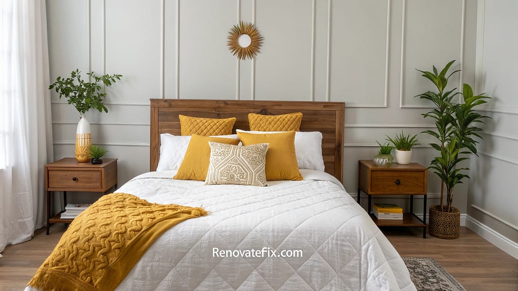 Scatter golden ochre throw pillows across your bed for an instant refresh that requires minimal investment.