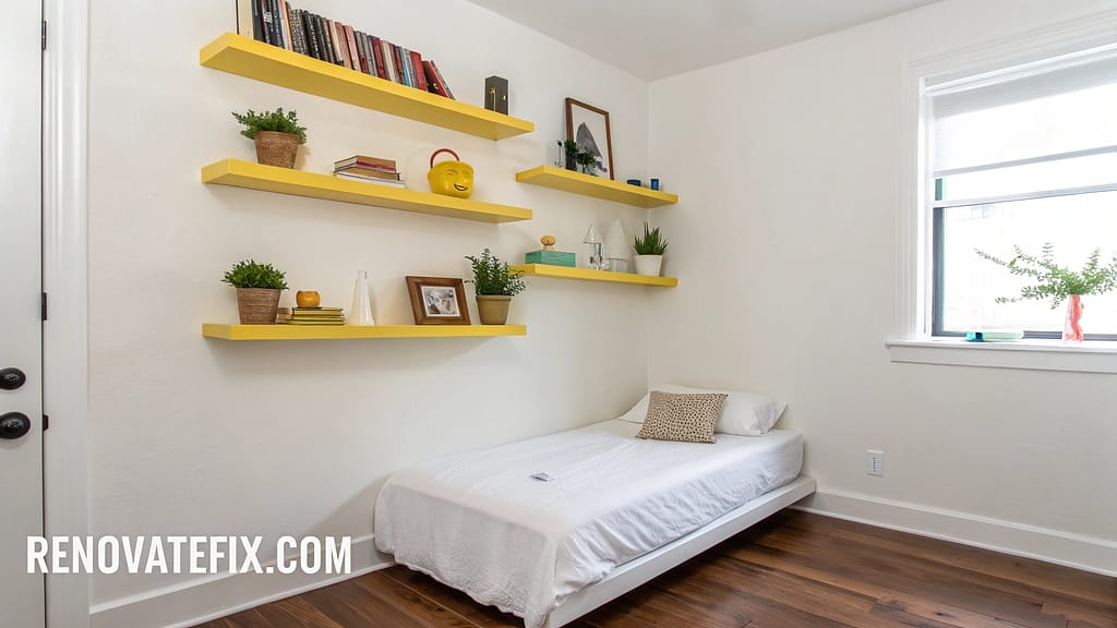 Mount canary yellow floating shelves against neutral walls to display favorite objects while introducing vibrant color.
