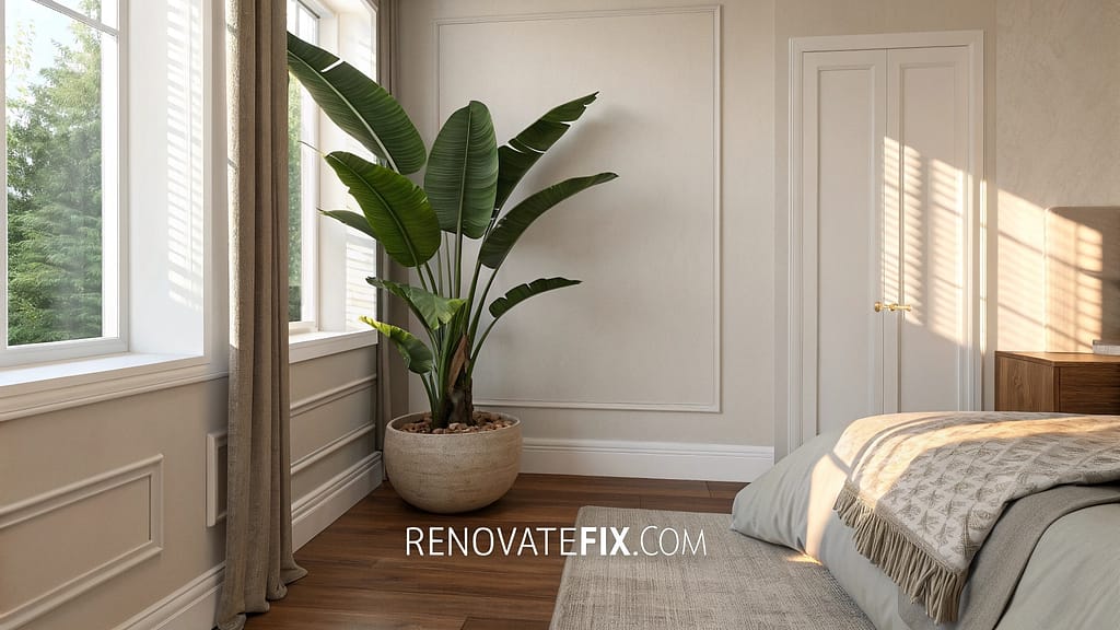 Create a vibrant natural display with broad banana leaf plants whose yellowish-green fronds bring organic energy to your bedroom.