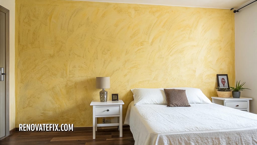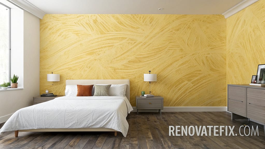 Create visual depth with corn silk yellow textured wall treatment using techniques like sponging, limewash, or plaster.